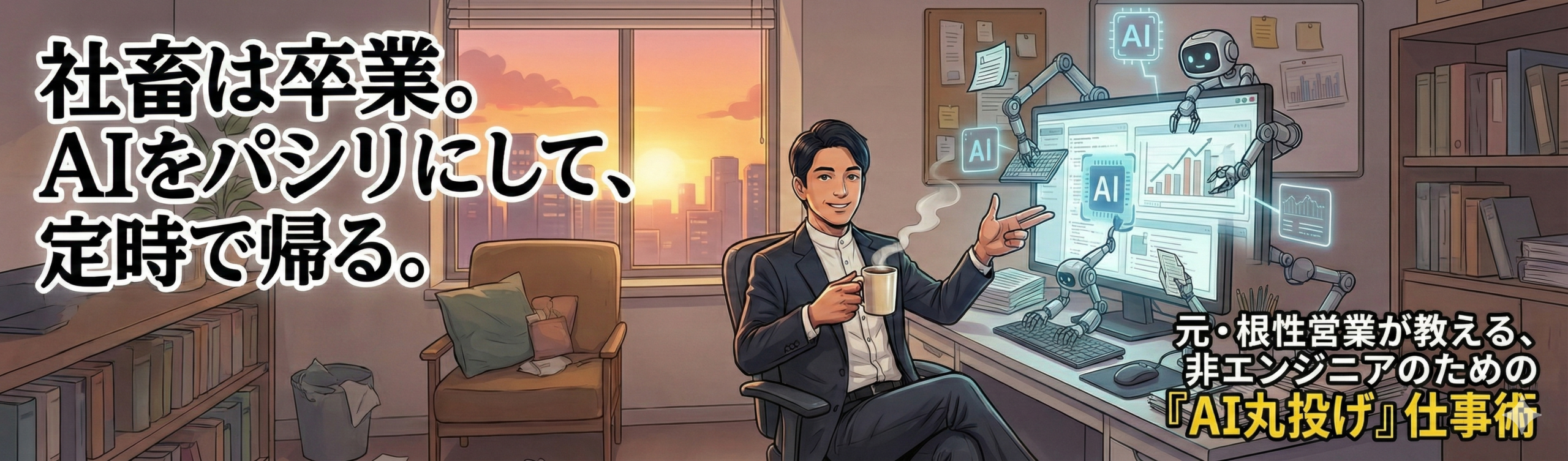 【実録】月80時間残業の「根性営業」が、AIで定時退社するために「捨てた3つの業務」と導入ツール全公開 はじめまして、りんごAI です。 「AI営業DXラボ」へようこそ。 この記事に辿り着いたあなたは、きっと毎日の業務に忙殺され、「もっと効率的に働けな...